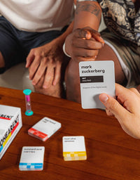 - What's Inside: Contains 500 cards, super high tech sand timer, instructions.