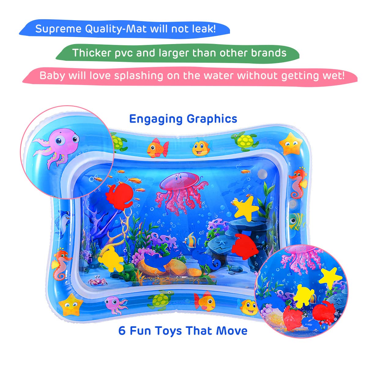 - BEST TUMMY TIME TOY: Enjoy the water time without getting wet! Your infant baby would be fascinated by the bright sea world graph and cute floating toys in the water. Parents can also have a fun time for watching the baby laugh and play